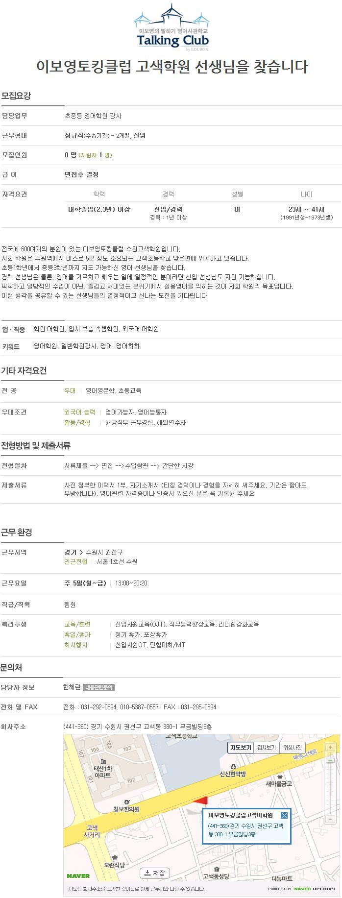 고색동 이보영의토킹클럽에서 초중등 영어선생님을 구합니다!