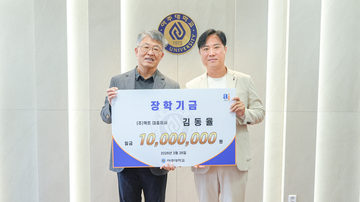 26일 율곡관 총장실에서 열린 기부금 전달식에는 채교석 ㈜두두인터내셔널 대표이사, 이규식 ㈜연합개발 대표이사, 김동율 주식회사 액트(ACTS) 대표이사가 참석했다. 학교에서는 최기주 총장과 조경숙 대학발전본부장, 강민철 경영인텔리전스학과 교수가 자리했다. 최기주 총장이 아주가족을 대표해 감사 인사를 전하고, 감사패와 예우품을 전달했다.