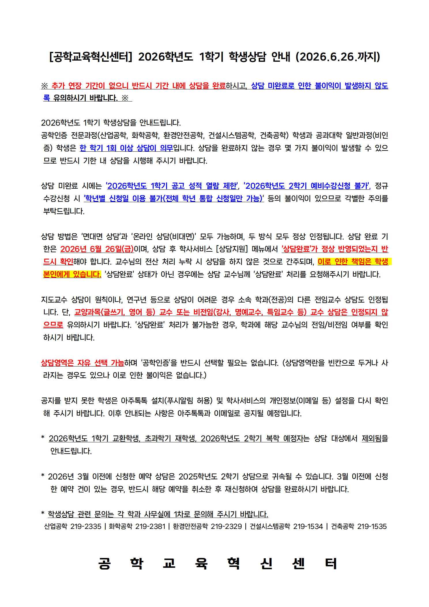 [학사] [공학교육혁신센터] 2026학년도 1학기 공학인증 학생상담 안내 (2026.6.26.까지) *기한 연장 없음*