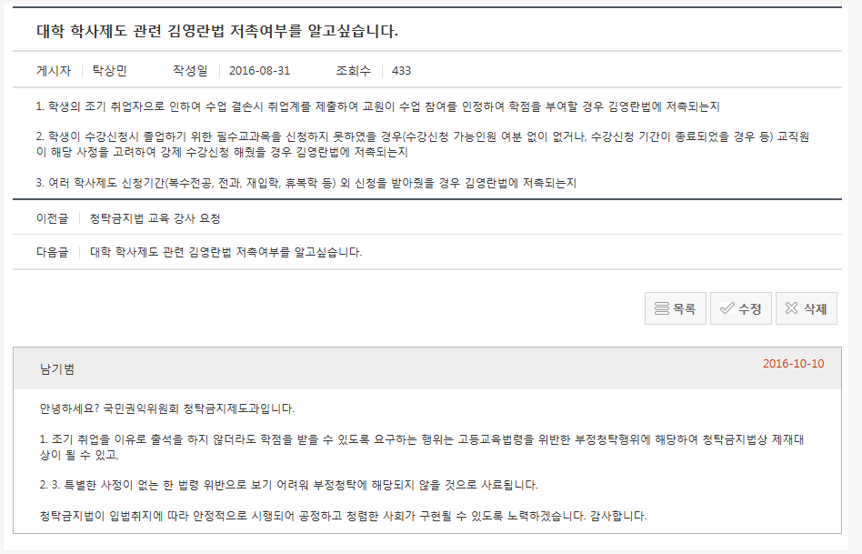 1.대학 학사와 관련 학사제도 신청기간 외 신청을 받아준 경우 청탁금지법에 저촉되는지 여부