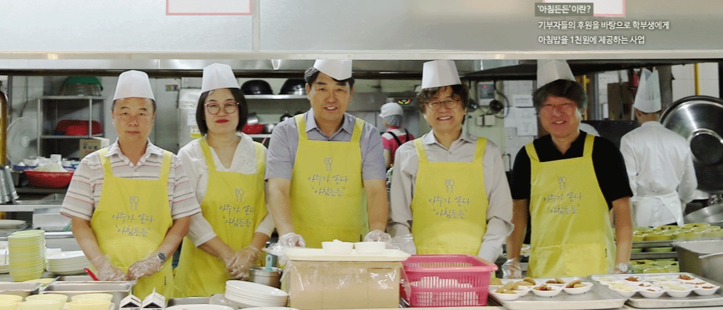 우리 학교 박형주 총장을 비롯해 유정훈 학생처장, 안창준 동문회장 등이 '아침든든' 일일 배식자로 나섰다.18일 오전 8시 '아침든든' 아침밥 배식이 시작됐다. '아침든든' 프로그램은 지난 1학기부터 시작된 사업으로, 아주대학교를 사랑하는 기부자들의 후원을 바탕으로 학부생들에게 아침밥을 1,000원에 제공하고 있다. 이 사업은 아주대학교 동문들의 사랑으로 지원된 아침밥을 학교에서 먹고 든든한 하루를 학생들이 설계하도록 마련됐다.일일 배식자로 나선 박형주 총장은 이른 아침 학생들과 만나 이야기하고 격려했다.박형주 총장은 "요즘 학생들이 아침을 거르는 경우가 많아 안타깝다"며 "한창 공부하고 활동적인 나이인 우리 학생들이 아침을 든든하게 먹는 것이 중요하다"고 말했다. 이어 박 총장은 "아침에 학생들을 직접 볼 수 있어 반가웠고, 이른 시간에도 아침을 거르지 않고 와줘서 대견하고 아침을 거르지 않고 꼭 챙겼으면 좋겠다"고 덧붙였다.'아침든든' 사업은 전액 기부금으로 운영되고, 한 끼당 2,000원이 이용자의 장학 내역에 등록된다. 우리 학교 학부생은 별도의 사전 신청없이 기숙사 식당과 팔달관 식당, 다산관 식당에서 학생증을 제시하고 1,000원으로 아침식사를 먹을 수 있다.