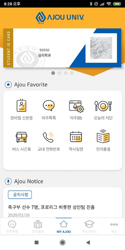 | 학생 | 학사서비스, 아주톡톡, 도서관, 홈페이지, 포탈, 아주BB, 증명서, 식단, 버스시간표, 교내 전화번호, 학사일정, 신분증, 전자출결 |