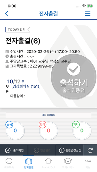 교수님이 지정한 인증번호를 입력한 경우, 출석으로 처리됩니다.